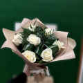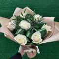 - Состав: Аспидистра (3шт.); Белая роза 60 см (7шт.); Лента атласная (1шт.); Пленка матовая (1шт.); Писташ (2шт.)