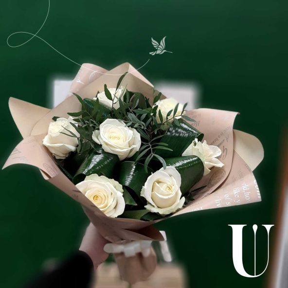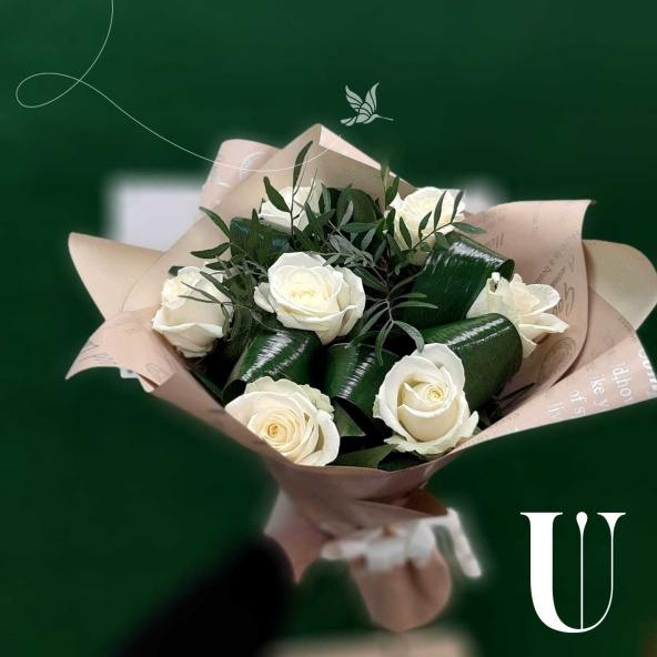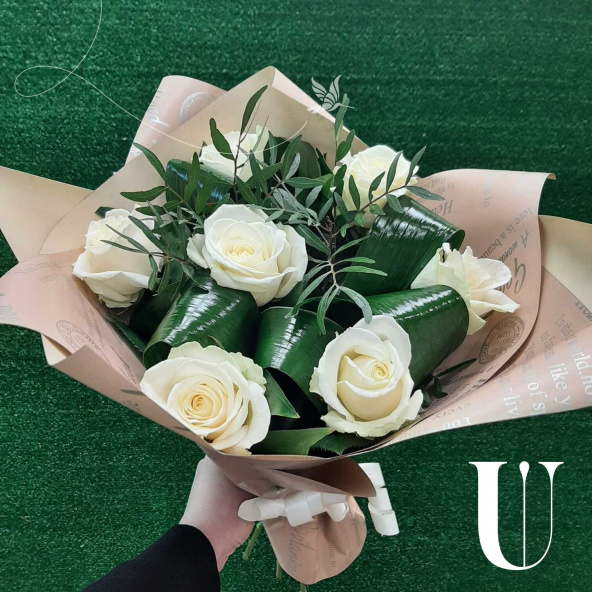 - Состав: Аспидистра (3шт.); Белая роза 60 см (7шт.); Лента атласная (1шт.); Пленка матовая (1шт.); Писташ (2шт.)