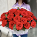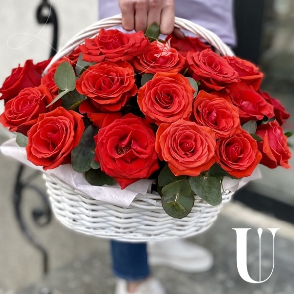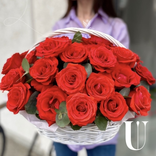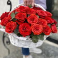 Композиция из 35 красных и белых роз в плетеной корзине