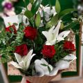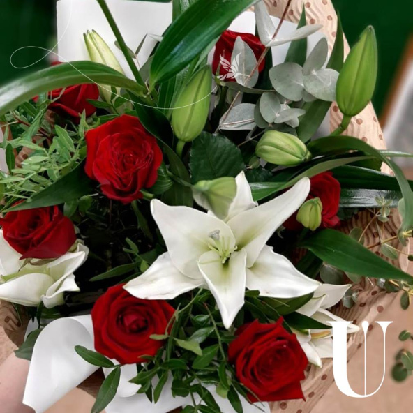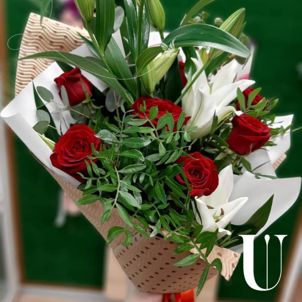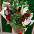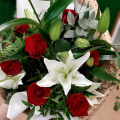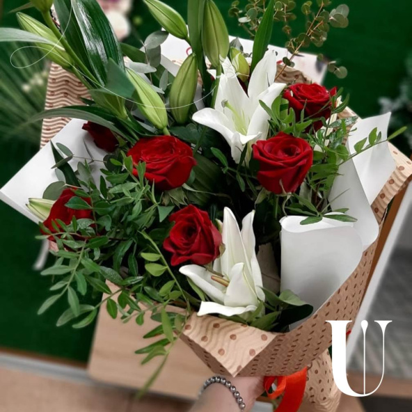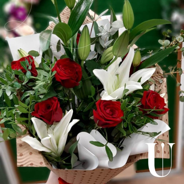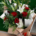 Букет из роз и лилий выполнен в бело красных тонах и оформлен в крафт бумагу. Букет словно тянется, ввысь, к новому этапу Вашей жизни.