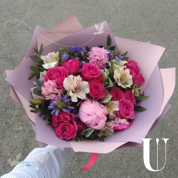 - Яркий сборный букет в составе: кустовая малиновая роза