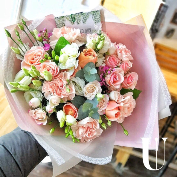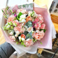 Цветочная композиция из кустовых хризантем, красных роз и орхидеи в упаковке