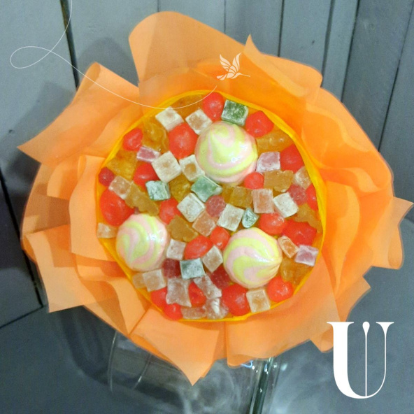 Мармелад 5 шт, рахат лукум 23 шт , кумкваты 20 шт , зефир 3 шт, упаковка