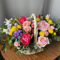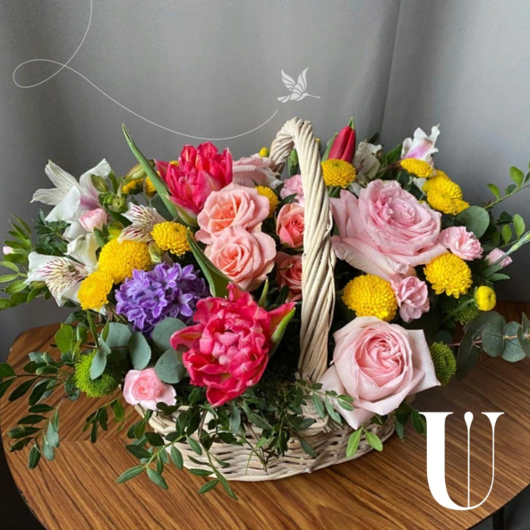 - В составе цветочной корзины весенний набор цветов: гиацинты