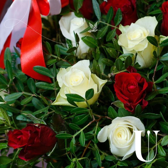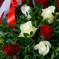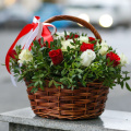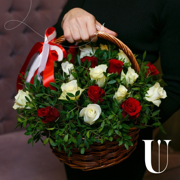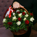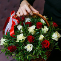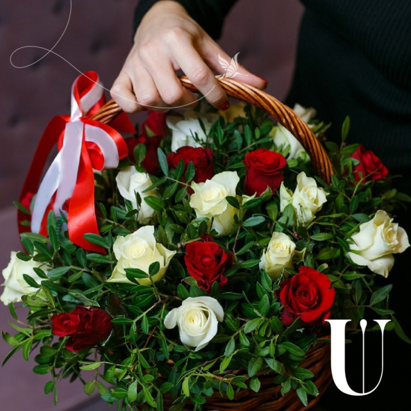 Корзина из 25 бело-красных роз с пышной фисташкой - подарок на любое торжество