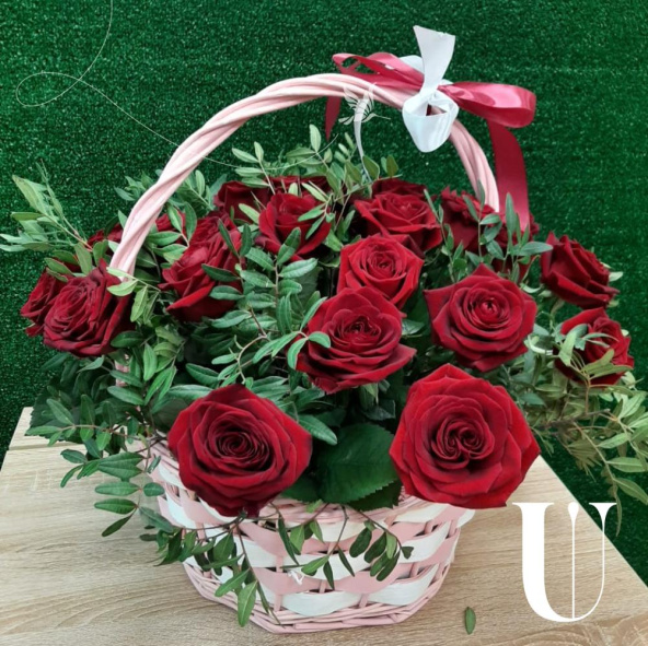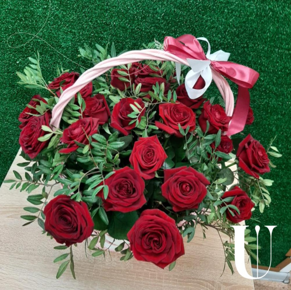 Корзина красных роз в зелени