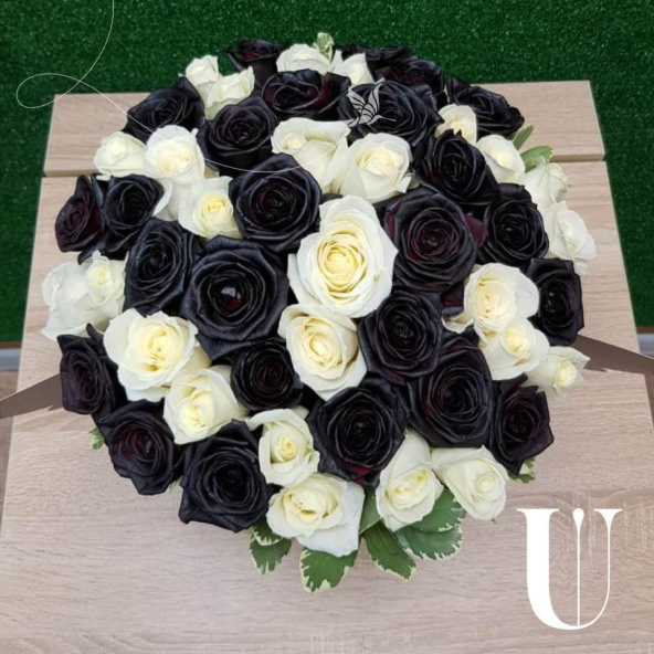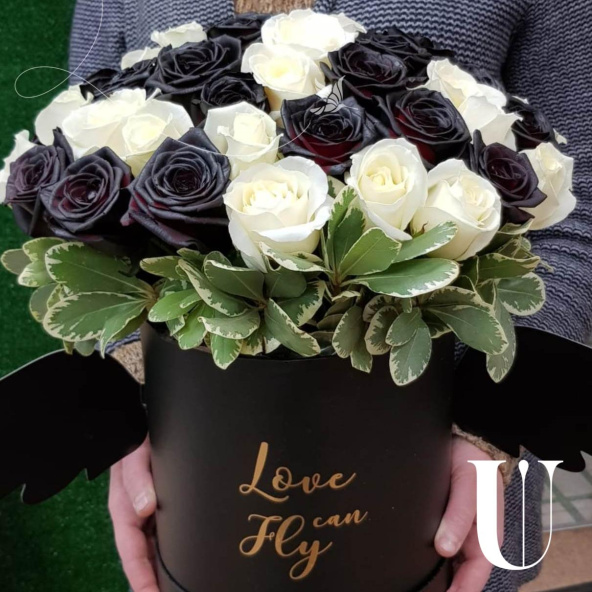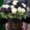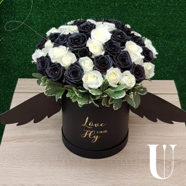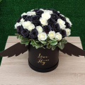 Белые и черные (крашенные флористической краской) розы в стильной черной коробке с крылышками или без. Для романтиков любящих удивлять!