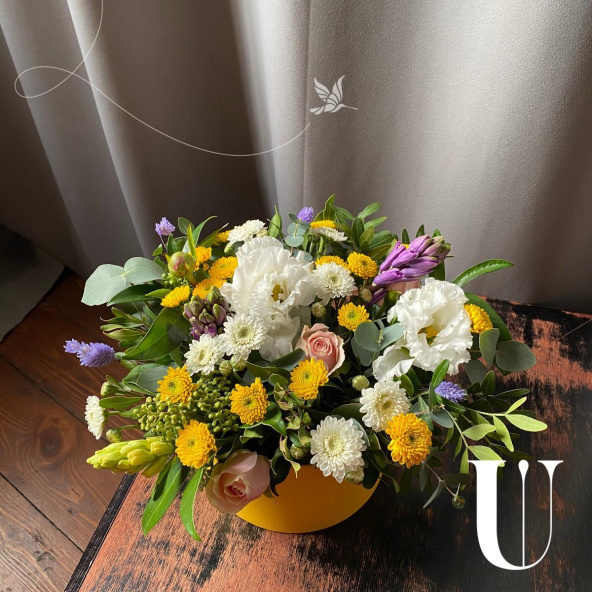 - В составе: Сантини Лимончелло-2шт; Эустома кружевная-3;Гиацинт-3шт;Роза кустовая-1шт; Скимия зелёная-3шт