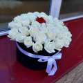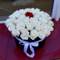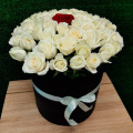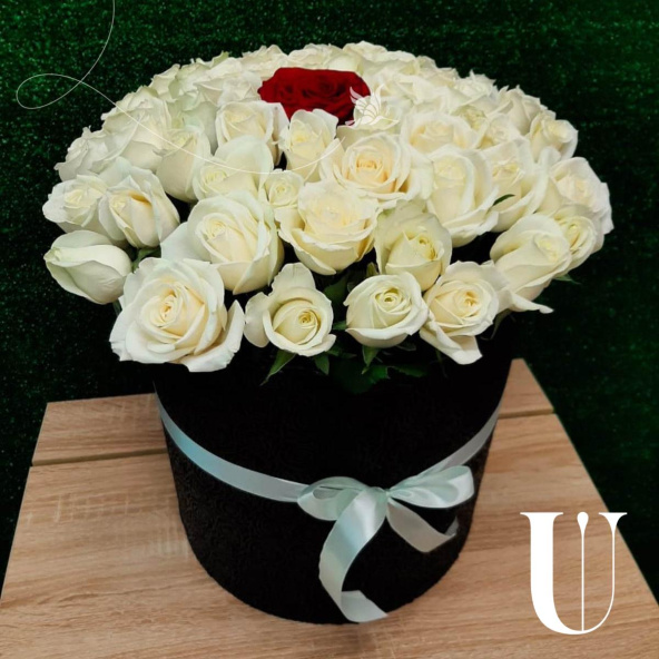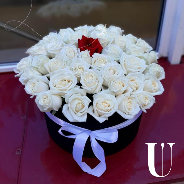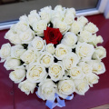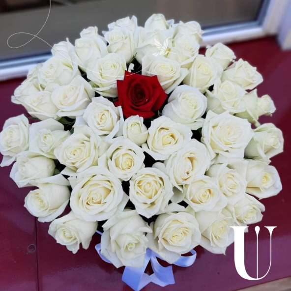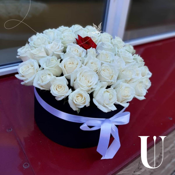Белые розы в центре алая или розовая по желанию, такие композиции всегда смотрятся по особому, намекая на неповторимость