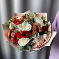 Композиция из красных роз и альстромерий микс в крафтовой упаковке