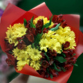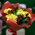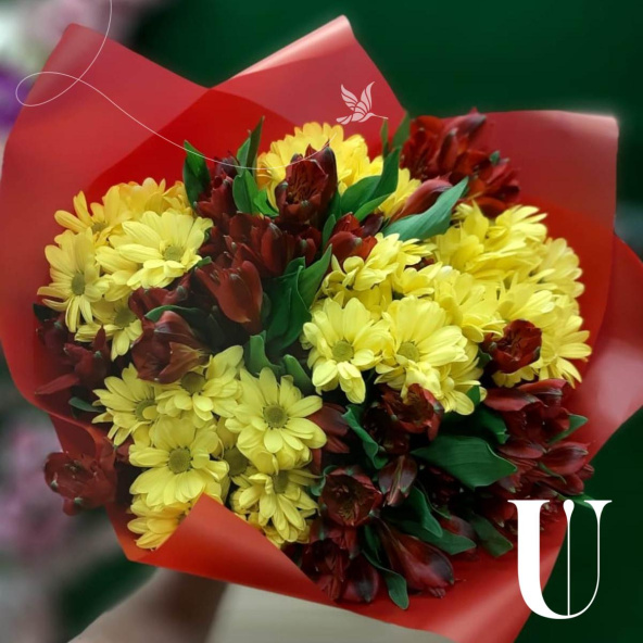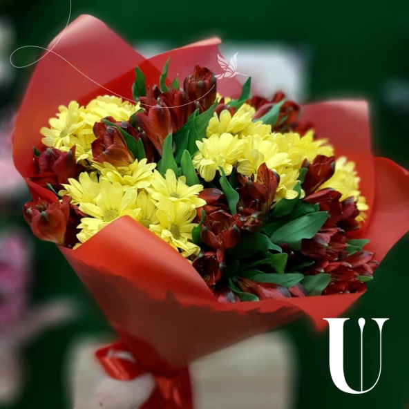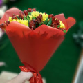 Яркий мини-букет из 7 гербер микс и писташи в упаковке