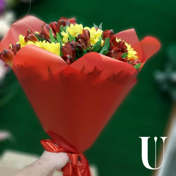 Весенний букет из синих ирисов и альстромерий микс в крафтовой упаковке