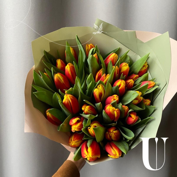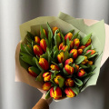 Монобукет из рыжих и красных роз в крафтовой упаковке