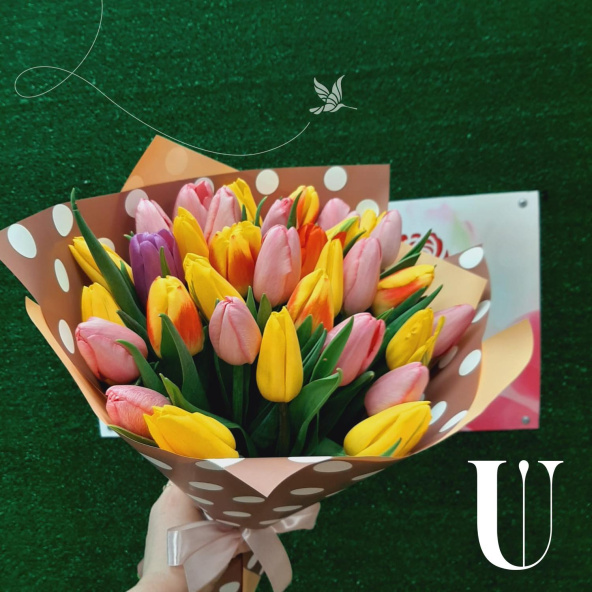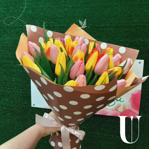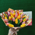 Композиция из красных роз и альстромерий микс в крафтовой упаковке