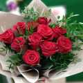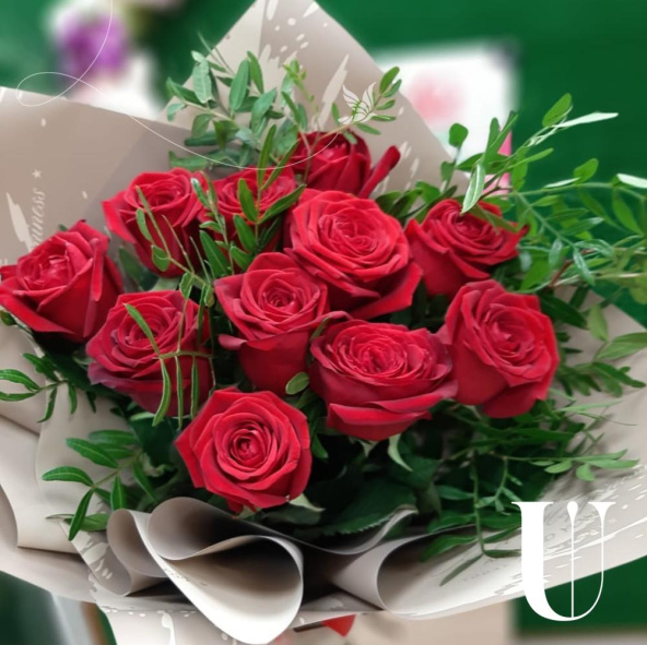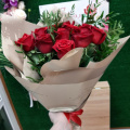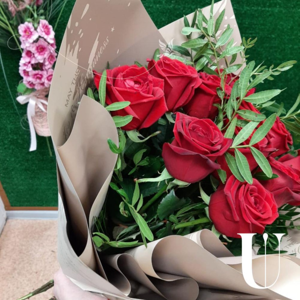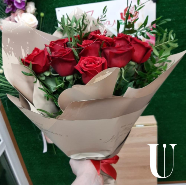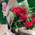 Монобукет из рыжих и красных роз в крафтовой упаковке
