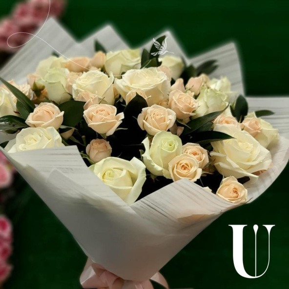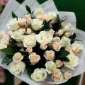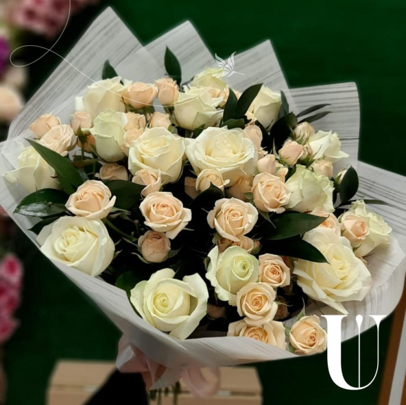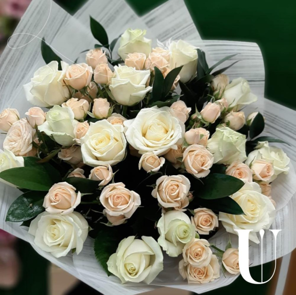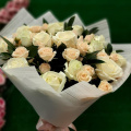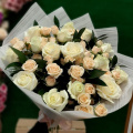 Классический букет из белых кустовых хризантем, красных роз и белых альстромерий в упаковке