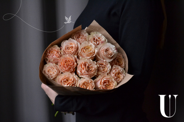 Монокомпозиция из розовых роз в крафтовой упаковке