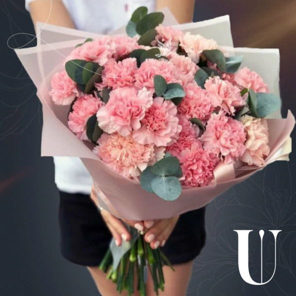 Букет "Грейта" из розовых гвоздик с эвкалиптом в матовой пленке с атласной лентой - это стильный и изысканный подарок, который подойдет для любого повода. В составе букета 25 розовых гвоздик, которые символизируют собой благодарность, заботу и уважение, и ветви эвкалипта, которые добавляют свежести и завершают нежный образ букета.