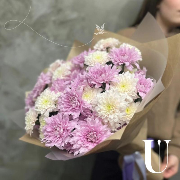 Букет из 15 белых и розовых кустовых хризантем Зембла в матовой пленке с атласной лентой - это отличный выбор для тех, кто хочет подарить радость и тепло близким людям.
