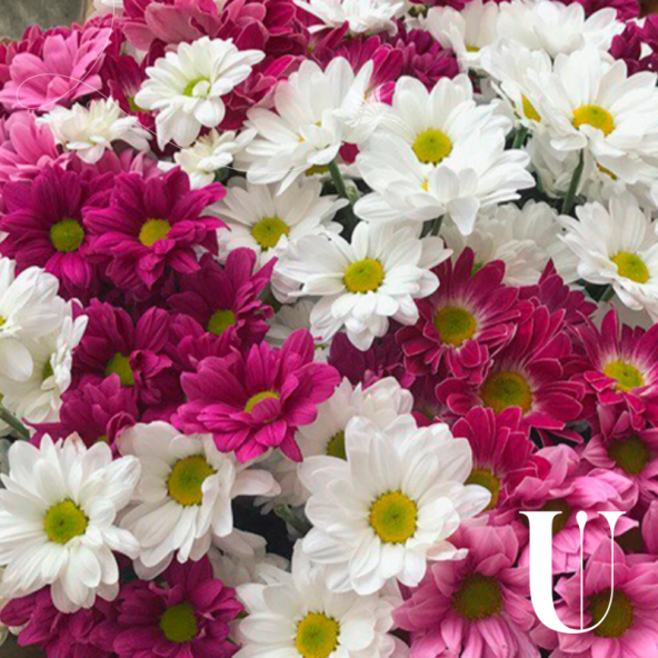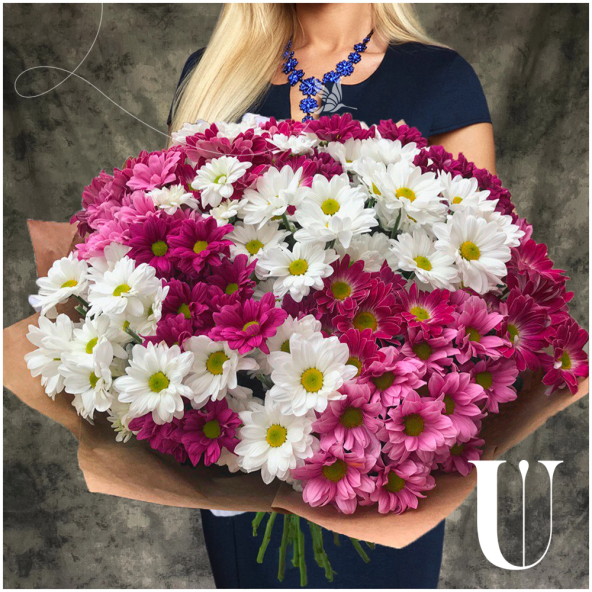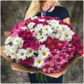 Букет из 25 кустовых хризантем "Розово-белый микс" в крафте с атласной лентой - это отличный выбор для тех, кто хочет подарить радость и тепло близким людям.