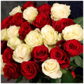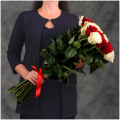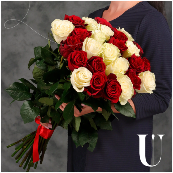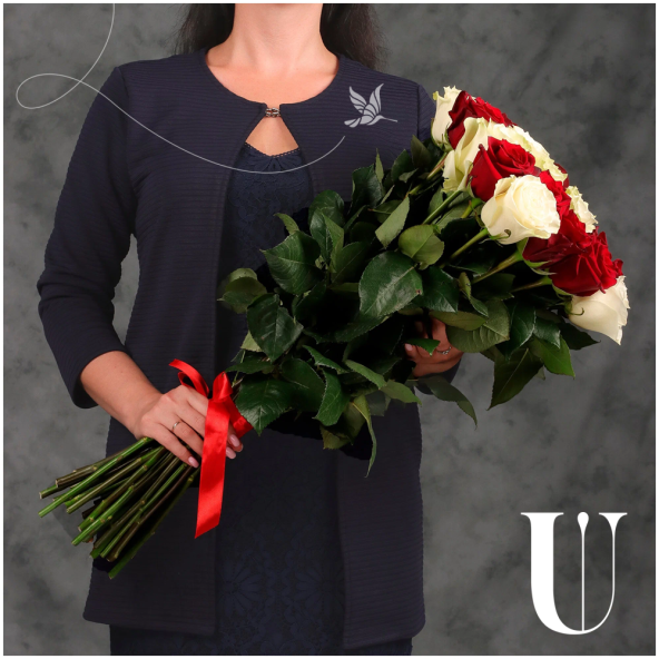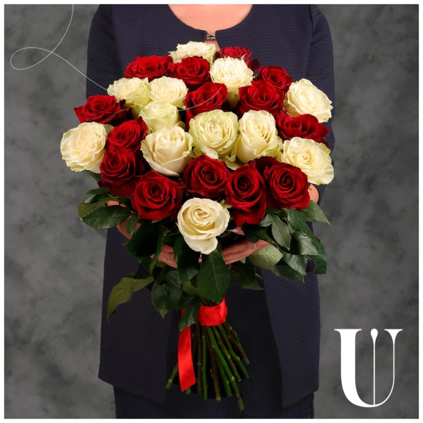 Букет из 25 красных и белых Эквадорских роз микс 60 см с атласной лентой - это стильный и элегантный подарок, который подойдет для любого повода. В составе букета розы сорта Эксплорер и Мондиаль – это высококачественные цветы, которые известны своими насыщенными оттенками и приятным ароматом, который будет радовать вас и ваших близких.
