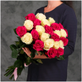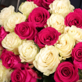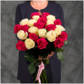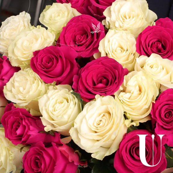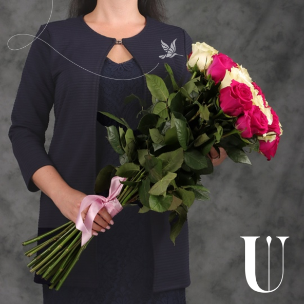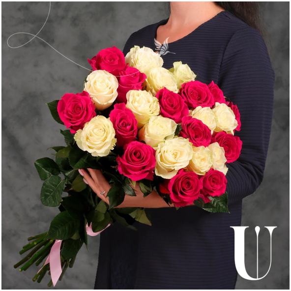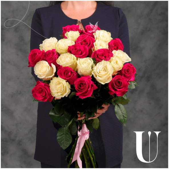 Букет из 25 белых и розовых Эквадорских роз микс 60 см с атласной лентой - это стильный и элегантный подарок, который подойдет для любого повода. В составе букета розы сорта Мондиаль и Пинк Флойд – это высококачественные цветы, которые известны своими насыщенными оттенками и приятным ароматом, который будет радовать вас и ваших близких.