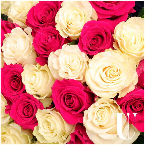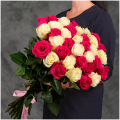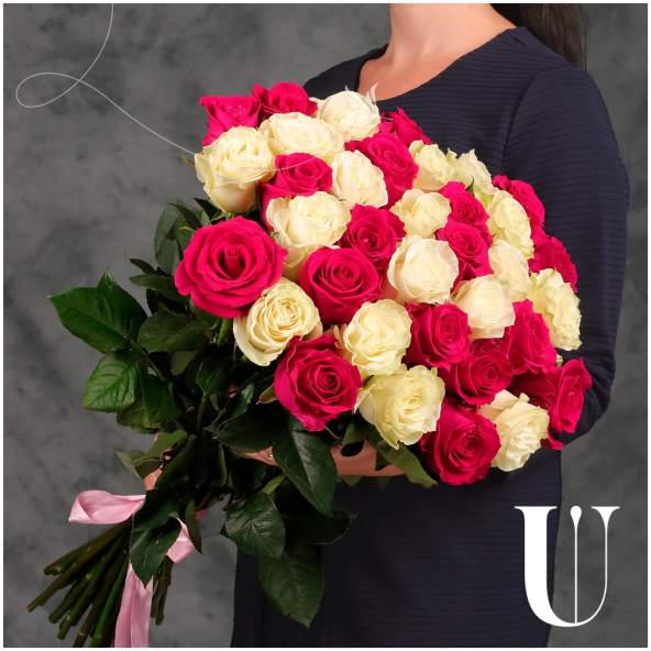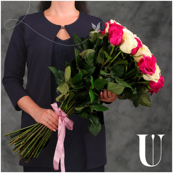 Букет из 31 белой и розовой Эквадорской розы микс 60 см с атласной лентой - это стильный и элегантный подарок, который подойдет для любого повода. В составе букета розы сорта Мондиаль и Пинк Флойд – это высококачественные цветы, которые известны своими насыщенными оттенками и приятным ароматом, который будет радовать вас и ваших близких.