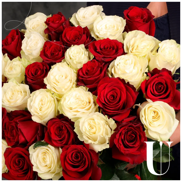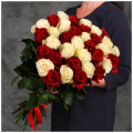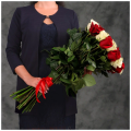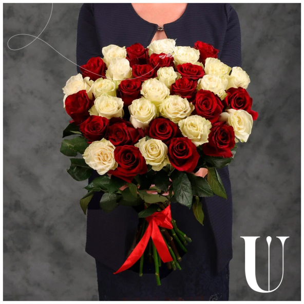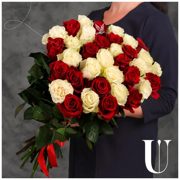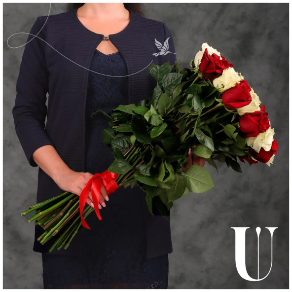 Букет из 35 красных и белых Эквадорских роз микс 60 см с атласной лентой - это стильный и элегантный подарок, который подойдет для любого повода. В составе букета розы сорта Эксплорер и Мондиаль – это высококачественные цветы, которые известны своими насыщенными оттенками и приятным ароматом, который будет радовать вас и ваших близких.