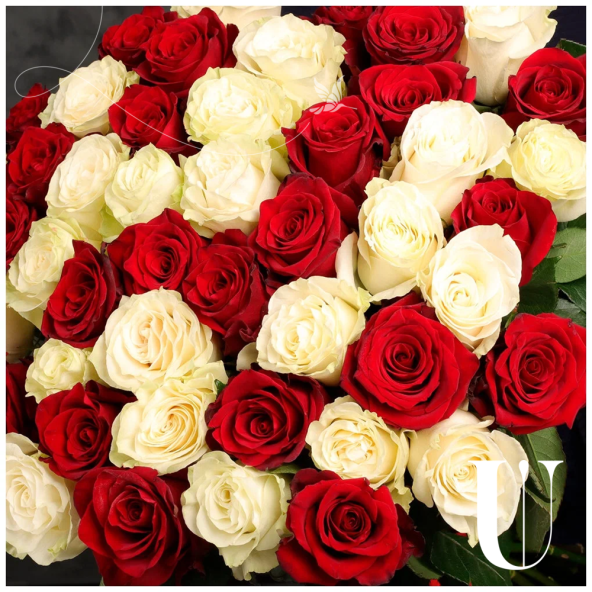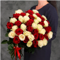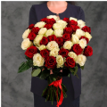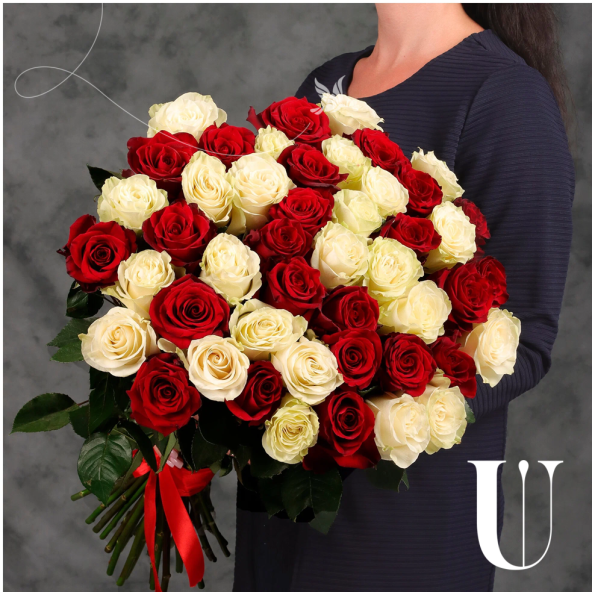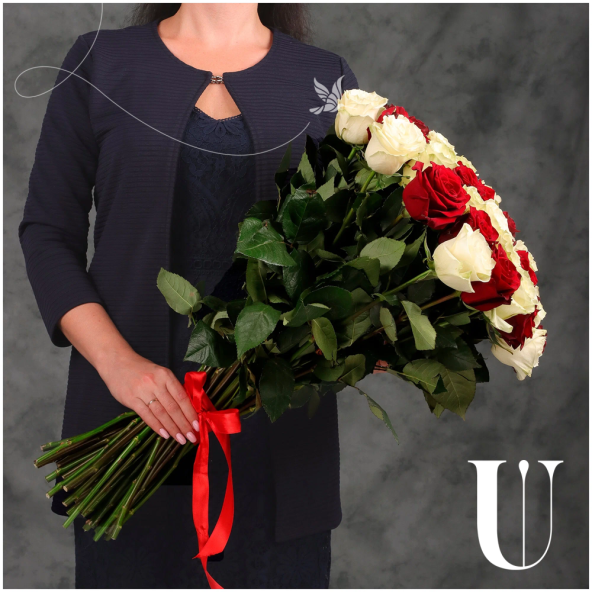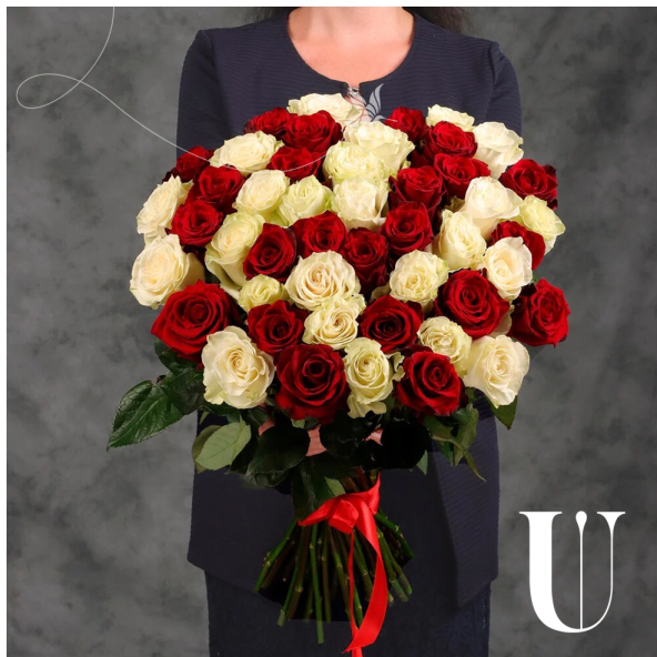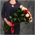 Букет из 45 красных и белых Эквадорских роз микс 60 см с атласной лентой - это стильный и элегантный подарок, который подойдет для любого повода. В составе букета розы сорта Эксплорер и Мондиаль – это высококачественные цветы, которые известны своими насыщенными оттенками и приятным ароматом, который будет радовать вас и ваших близких.