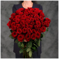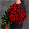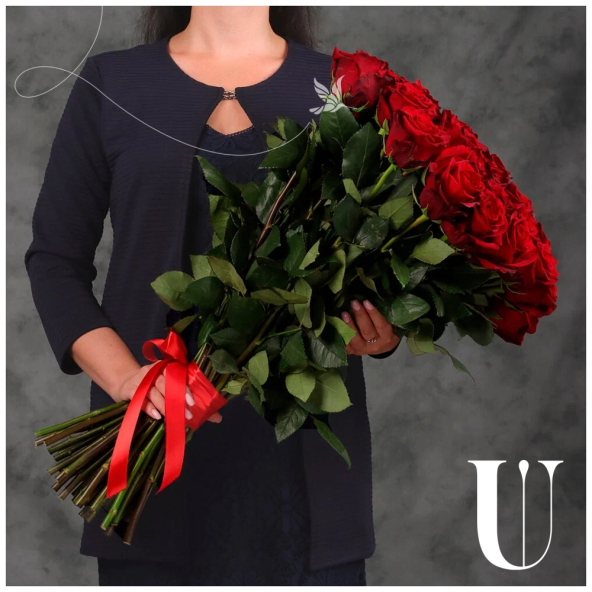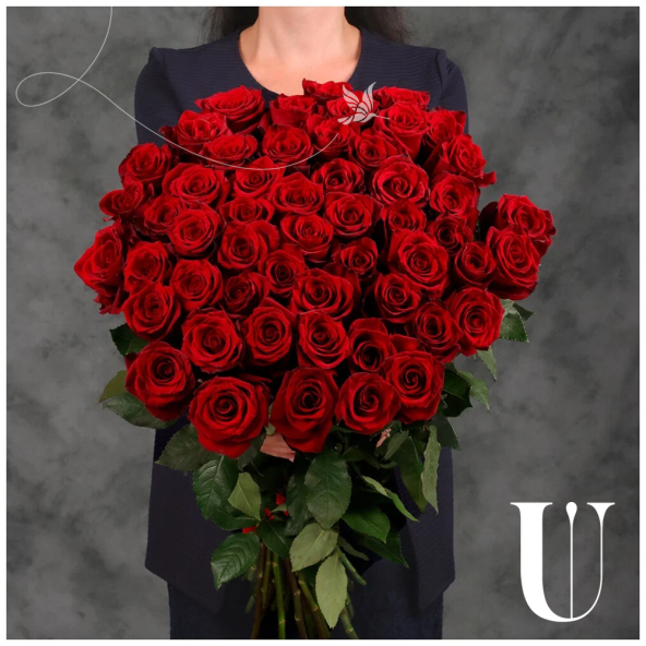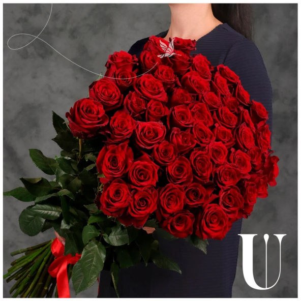 Букет из 55 красных Эквадорских роз 60 см с атласной лентой - это стильный и элегантный подарок, который подойдет для любого повода. В составе букета розы сорта Эксплорер – это высококачественные цветы, которые известны своим насыщенным красным цветом и приятным ароматом, который будет радовать вас и ваших близких.