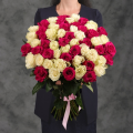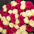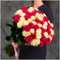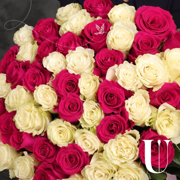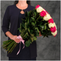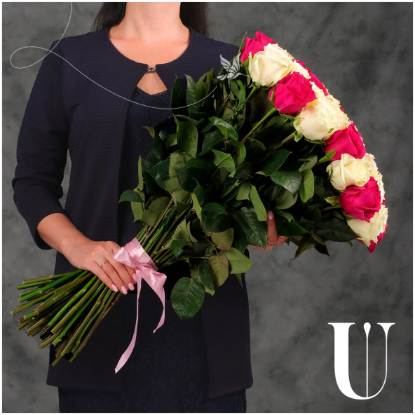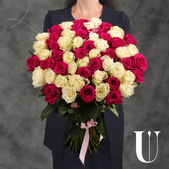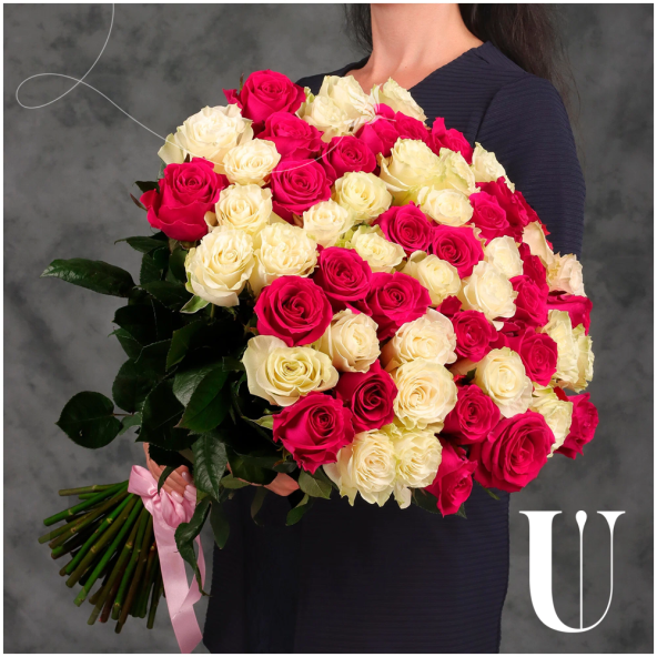 Букет из 55 белых и розовых Эквадорских роз микс 60 см с атласной лентой - это стильный и элегантный подарок, который подойдет для любого повода. В составе букета розы сорта Мондиаль и Пинк Флойд – это высококачественные цветы, которые известны своими насыщенными оттенками и приятным ароматом, который будет радовать вас и ваших близких.