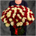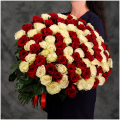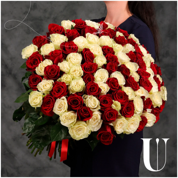 Букет из 101 красной и белой Эквадорской розы микс 60 см с атласной лентой - это стильный и элегантный подарок, который подойдет для любого повода. В составе букета розы сорта Эксплорер и Мондиаль – это высококачественные цветы, которые известны своими насыщенными оттенками и приятным ароматом, который будет радовать вас и ваших близких.