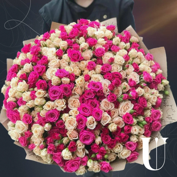 Большой букет из 101 белой и розовой кустовой розы в крафте с атласной лентой - это стильный и элегантный подарок, который подойдет для любого повода. Кустовые розы в составе букета - это разновидность роз, которая отличается пышностью и объемностью бутона, а композиция из них выглядит утонченно и изысканно. Белые и розовые оттенки роз в букете создают гармоничную и нежную композицию.