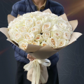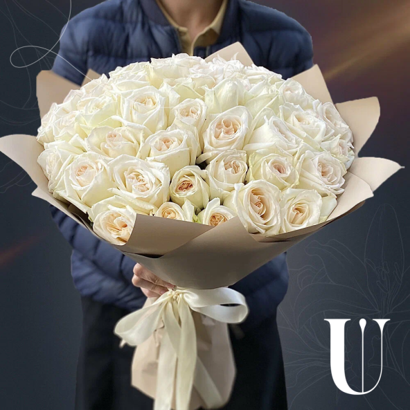 Монобукет из 51 пионовидной розы сорта White O'Hara в матовой пленке с атласной лентой - это изысканный и стильный подарок, который станет незабываемым сюрпризом для любого торжества или особого случая. Роскошные пионовидные розы сорта White O'Hara белого оттенка в составе букета обладают уникальной формой бутонов и незабываемым ароматом.