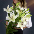 Букет из 3 белых Голландских лилий с атласной лентой - это изысканный и стильный подарок, который станет незабываемым сюрпризом для любого торжества или особого случая. Белые лилии в составе букета символизируют чистоту и невинность, а также обладают незабываемым ярким ароматом.