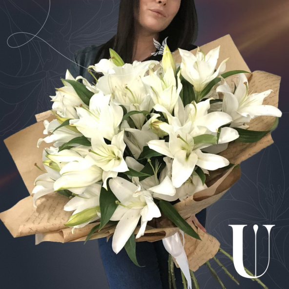 Букет из 11 белых Голландских лилий в крафте с атласной лентой - это изысканный и стильный подарок, который станет незабываемым сюрпризом для любого торжества или особого случая. Белые лилии в составе букета символизируют чистоту и невинность, а также обладают незабываемым ярким ароматом.