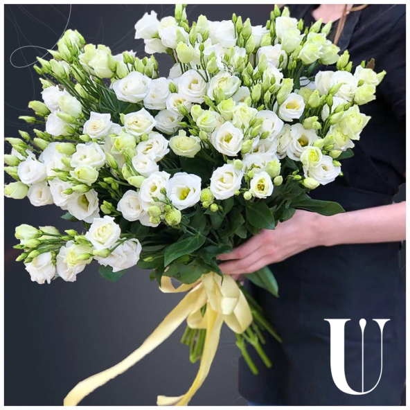 Букет из 35 белых эустом с широкой атласной лентой - это стильный и изысканный подарок, который подойдет для любого повода. Эустома (лизиантус) - это нежный цветок, родом из Америки, напоминающий миниатюрную розу. Они очень стойкие и долго будут радовать получателя своей красотой и элегантностью.