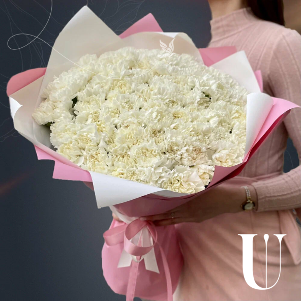Выбирая монобукет из 51 белой гвоздики, вы дарите знак благодарности и нежности, который, несомненно, будет оценен получателем.
