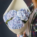 Букет из 3 голубых гортензий в крафте с атласной лентой - это стильный и изысканный подарок, который подойдет для любого повода. В составе букета голубые гортензии, которые символизируют прощение, понимание и безмятежность. Соцветия гортензии крупные и пышные, что придает букету особенный шарм.
