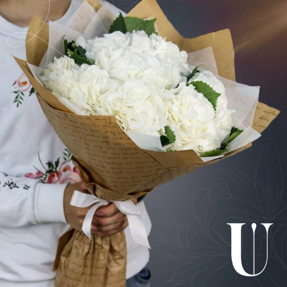 Букет из 7 белых гортензий в крафте с атласной лентой - это стильный и изысканный подарок, который подойдет для любого повода. В составе букета белые гортензии, которые символизируют чистоту, изящество и искренность. Соцветия гортензии крупные и пышные, что придает букету особенный шарм.