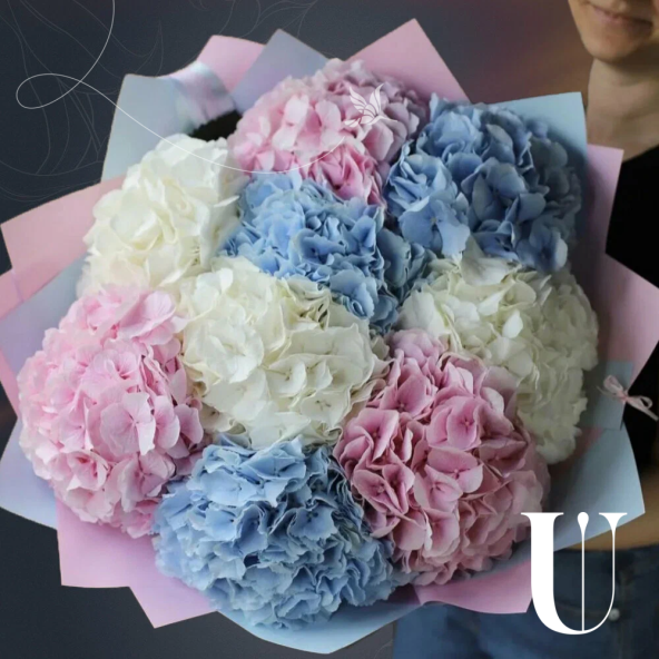 Букет из 9 гортензий микс в матовой пленке с атласной лентой - это стильный и изысканный подарок, который подойдет для любого повода. В составе букета белая, розовая и голубая гортензии, которые образуют шикарный микс. Соцветия гортензии крупные и пышные, что придает букету особенный шарм.