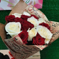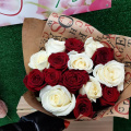 Монобукет из рыжих и красных роз в крафтовой упаковке