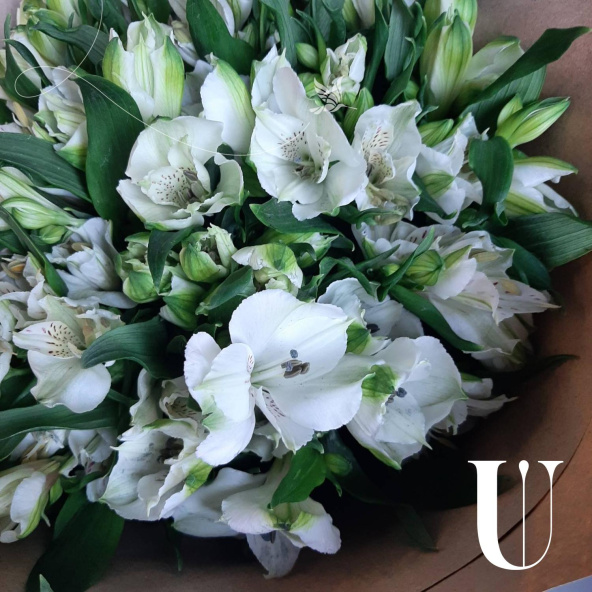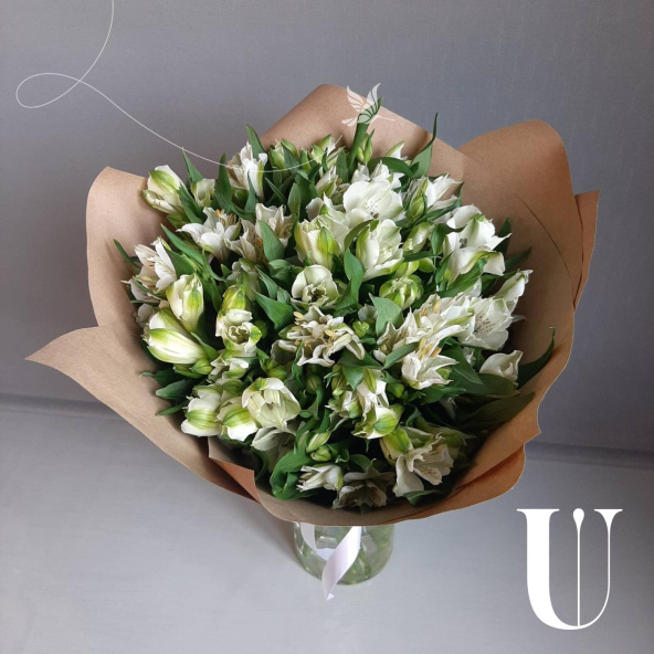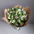 Весенний букет из синих ирисов и альстромерий микс в крафтовой упаковке