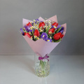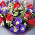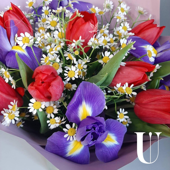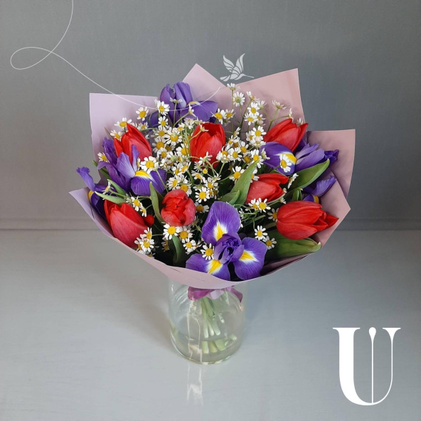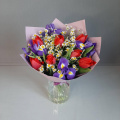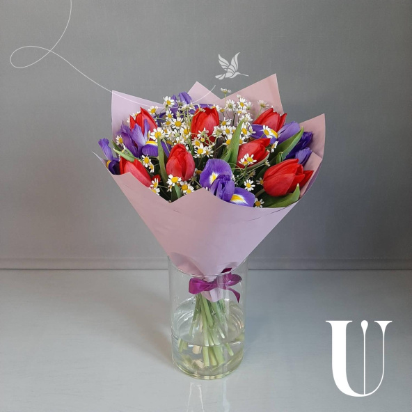 Весенний букет из синих ирисов и альстромерий микс в крафтовой упаковке