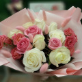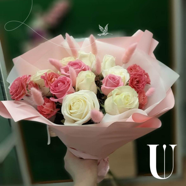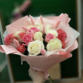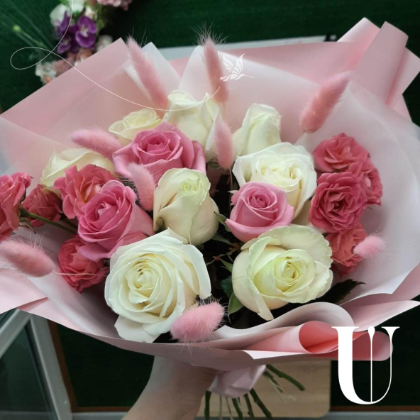 Букет из роз в пастельных тонах с лагурусом (сухоцвет)