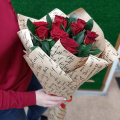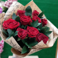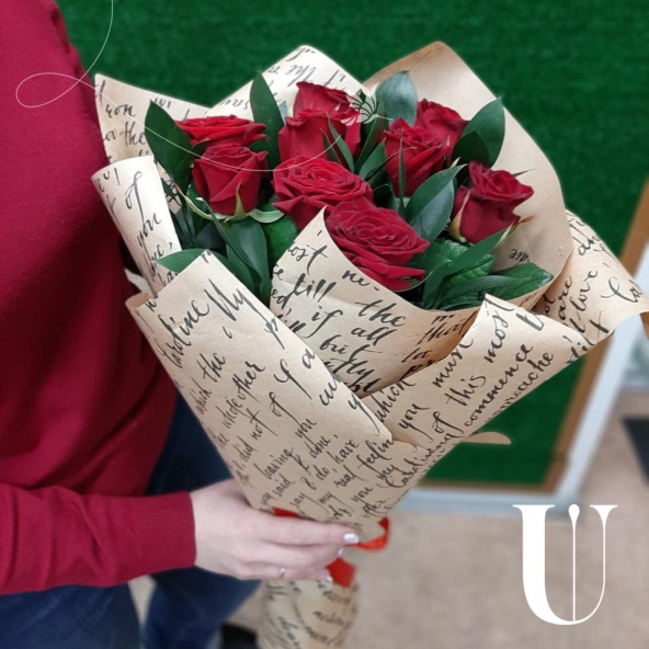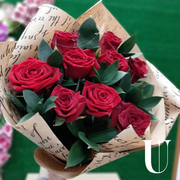 Не большой букет из 9 красных роз, украшенный листьями зелени, которые вносят свою нотку свежести и натуральности