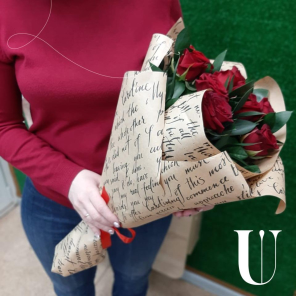 Монокомпозиция из розовых роз в крафтовой упаковке