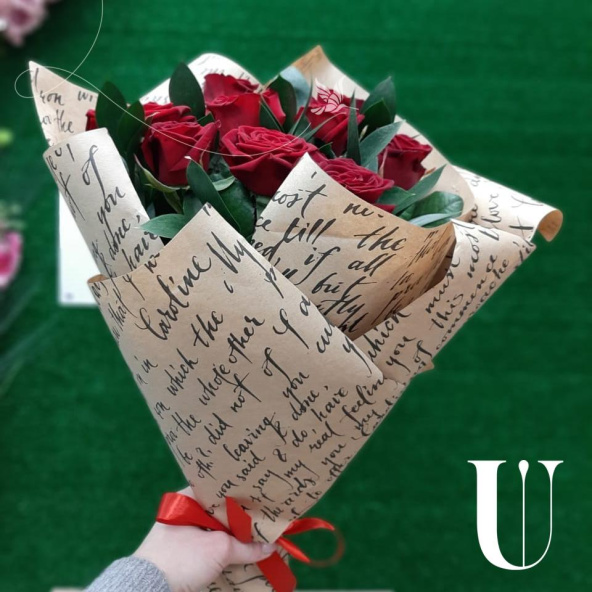 Композиция из красных роз и альстромерий микс в крафтовой упаковке