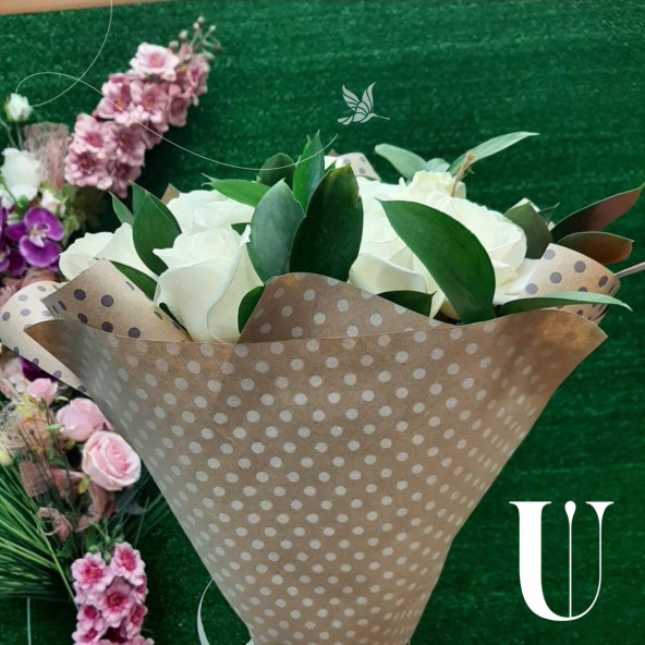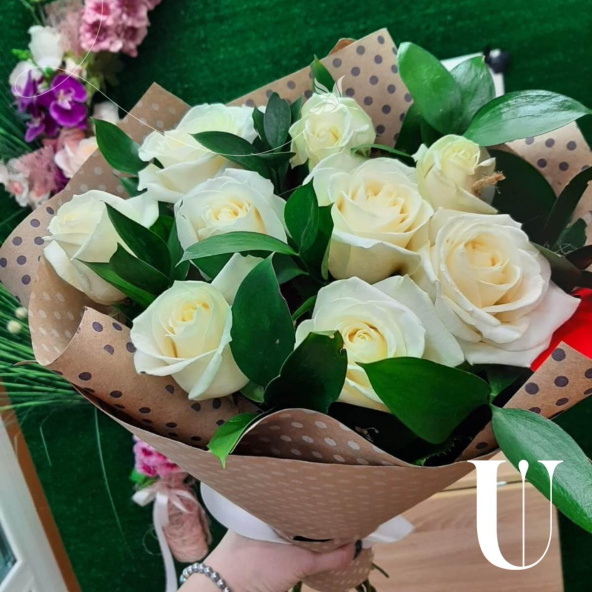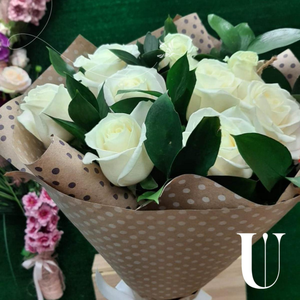 9 белых роз с рускусом