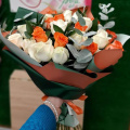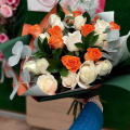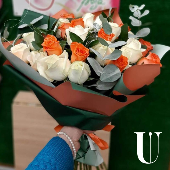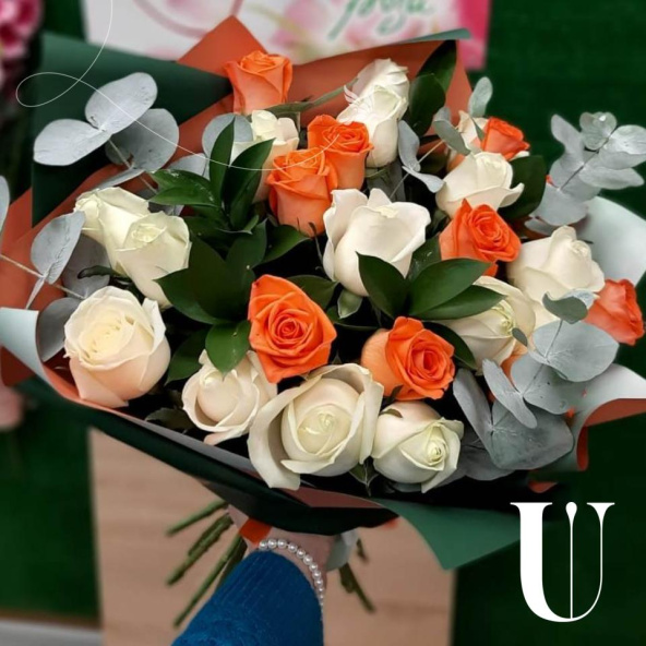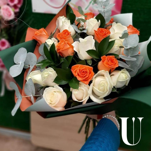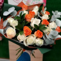 Моно букет из белых и коралловых роз с ароматным эвкалиптом - модная тенденция этого года. Это достаточно пышный букет, который вполне самодостаточен тем более дополненный рускусом